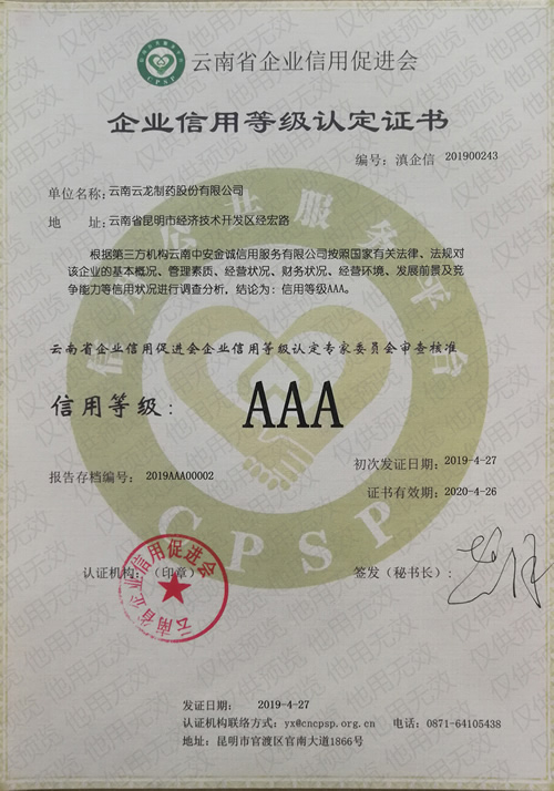 日前,第三方權(quán)威機(jī)構(gòu)按照國(guó)家法律、法規(guī)對(duì)我司的基本概況、管理素質(zhì)、經(jīng)營(yíng)狀況、財(cái)務(wù)狀況、經(jīng)營(yíng)環(huán)境、發(fā)展前景及競(jìng)爭(zhēng)能力等信用狀況進(jìn)行調(diào)查分析,決定授予云龍制藥企業(yè)信用等級(jí)認(rèn)定證書(shū)AAA級(jí)的殊榮。
