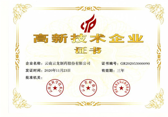 近日,云南云龍制藥股份有限公司(以下簡稱“云龍制藥”)被認定為“國家級高新技術(shù)企業(yè)”,這是繼2011年首次認定,2014年復審通過,2017年第二次認定之后,云龍制藥第三次獲此認定。